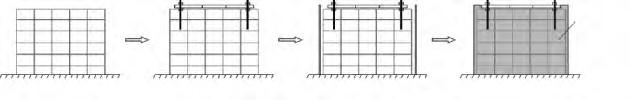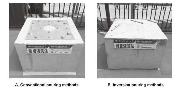 Pouring order of seismic isolation buttress is as follows: conventional pouring methods (670mm x 670mm embedded parts), conventional pouring methods (970mm x 970mm embedded parts), pouring first before putting parts methods (670mm x 670mm embedded parts), second time pouring with fine stone concrete methods (670mm x 670mm embedded parts),second time pouring with fine stone concrete methods (970mm x 970mm embedded parts), second time pouring with highly strong grouting material methods (670mm x 670mm embedded parts), inversion pouring methods (670mm x 670mm embedded parts).