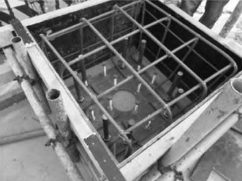 (1)Tie the reinforcement to the pier, and fix shuttering. One of buttress which used for the pouring first before putting construction needs to be fixed with 4 pieces spacer bar at the bottom of plate, the rebar should go through four small gas vents exactly, as shown in Figure 8.